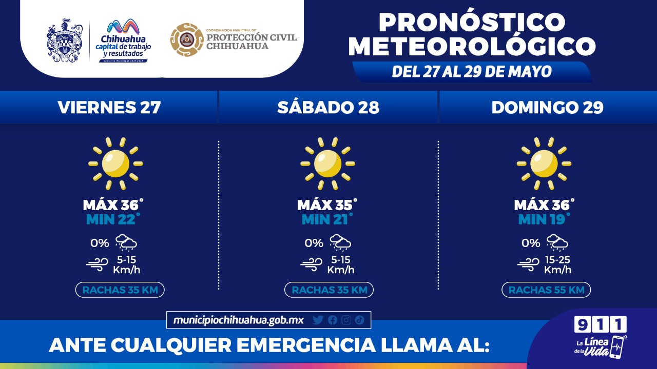De acuerdo al pronóstico que emite el Servicio Meteorológico Nacional de CONAGUA, para este viernes se espera una máxima de 36°C y una mínima de 22°C con vientos de hasta 35 kilómetros por hora con un cielo mayormente soleado; por otra parte, para el sábado esperamos una máxima de 35°C y mínima de 21°C, con vientos de hasta 35 kilómetros por hora.