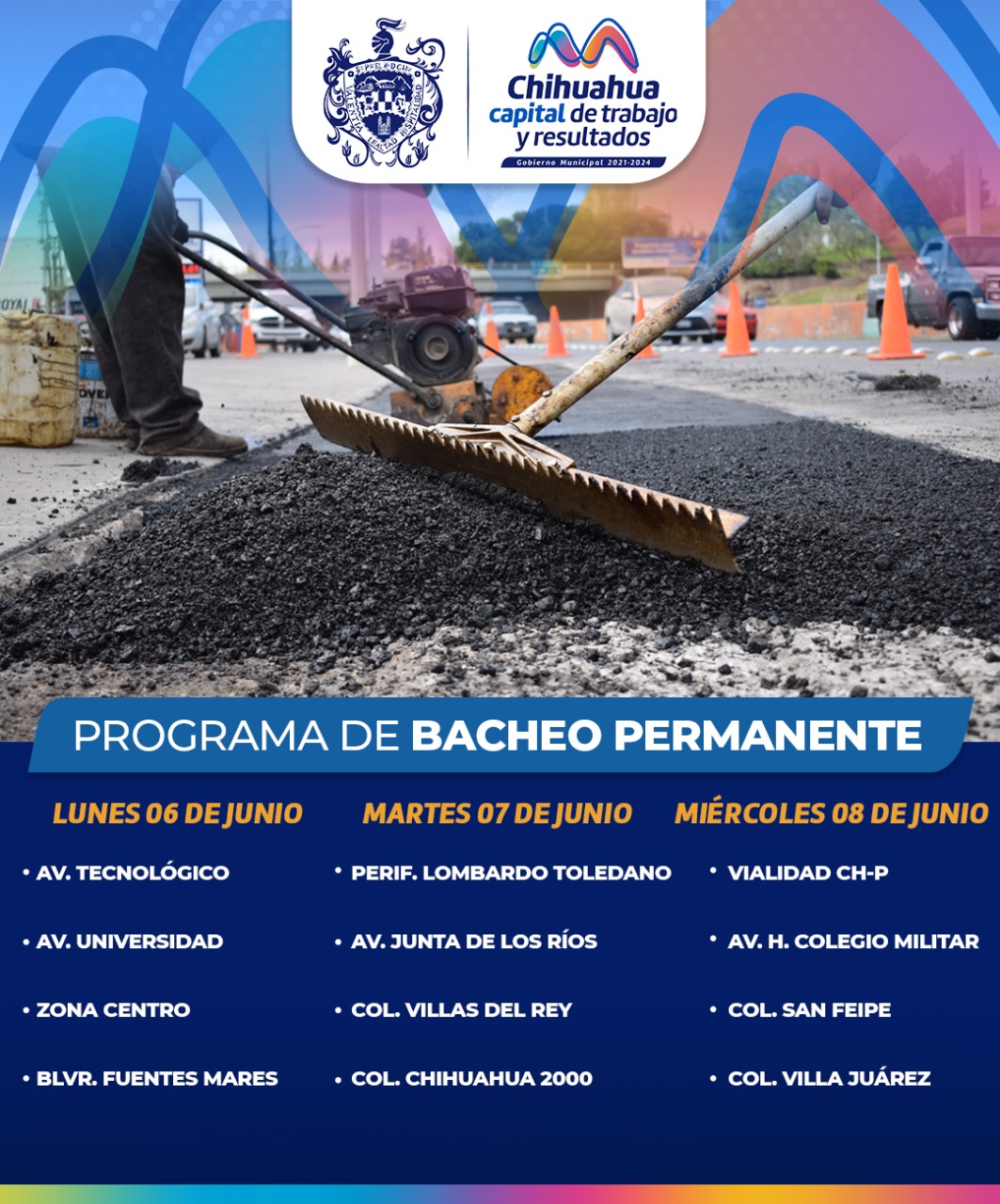 La Dirección de Obras Públicas, pide tomar precauciones a los conductores por los trabajos de bacheo que realizará los próximos tres días de esta semana en diferentes avenidas y calles de la ciudad, a fin de evitar contratiempos.