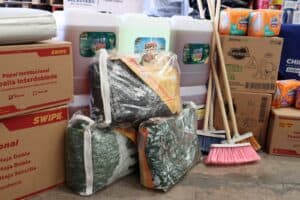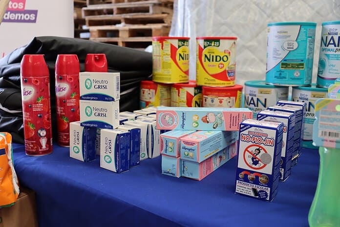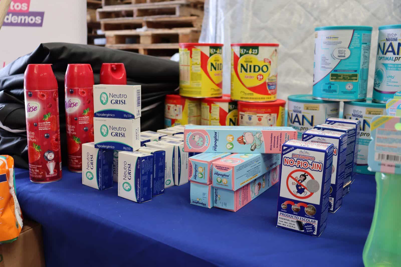 El material entregado incluye colchones, cobijas matrimoniales y fundas anti-ácaros, frazadas; artículos de higiene y cuidado como jabones neutros, champús, toallitas húmedas, crema corporal y para rozaduras, pañales y fórmulas lácteas, y papel higiénico.