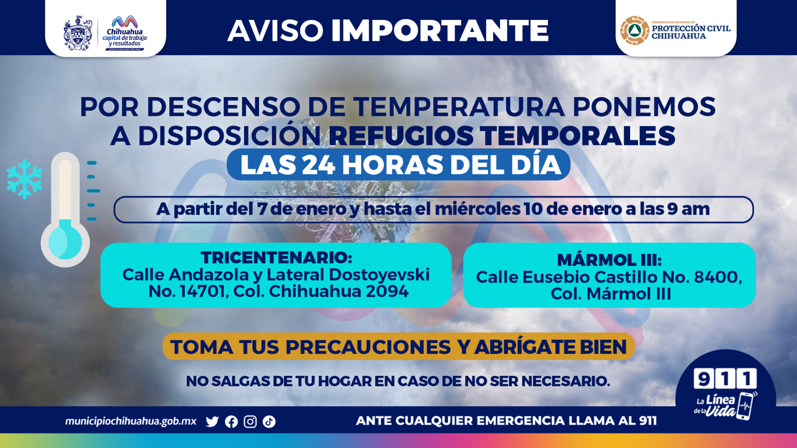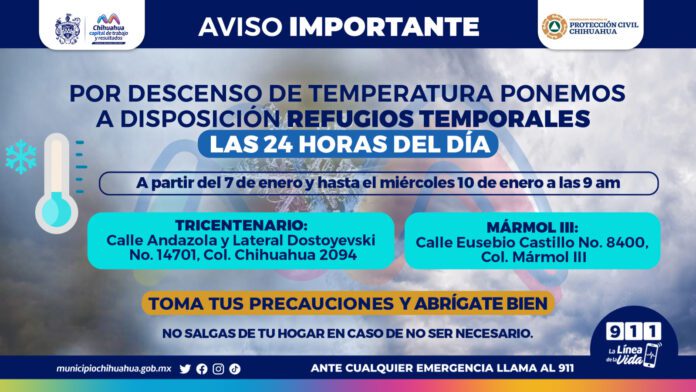 Ante las bajas temperaturas que se pronostican para las próximas horas en la ciudad de Chihuahua, el Gobierno Municipal ha determinado habilitar las 24 horas los dos refugios temporales a partir de hoy a las 7:00 de la tarde y hasta el día 10 de enero, con el fin de resguardar a las personas que requieran protegerse del frío.