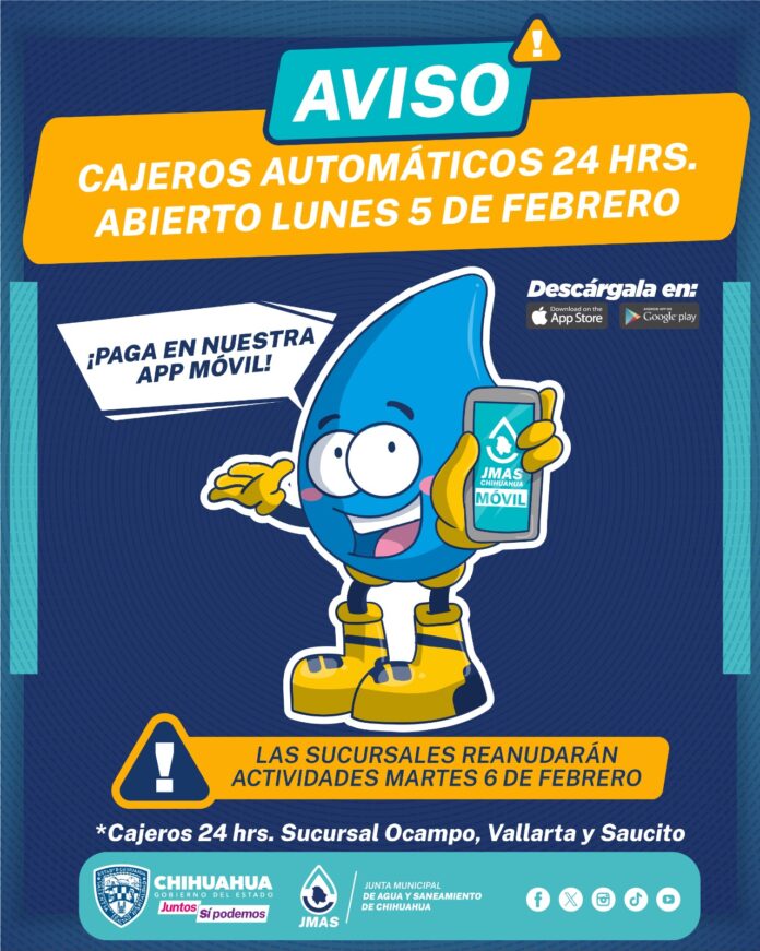 La Junta Municipal de Agua y Saneamiento (JMAS) de Chihuahua informó que este 5 de febrero las sucursales del organismo estarán parcialmente abiertas mediante los cajeros automáticos, al tratarse de un día inhábil por la promulgación de la Constitución de 1917, por lo cual la atención a usuarios se reanudará el martes 6 de febrero en sus horarios habituales.