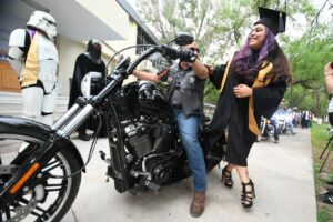 Bajo la sombra de los árboles de los jardines frontales de la Facultad, se contó con la presencia de los Motoclubes ”Panza Grande” y “Aces” como escoltas. El Grupo “Chihuahua Celebration One”, que organiza diferentes actividades alusivas a Star Wars, dio la bienvenida tanto a graduandos, autoridades y público que asistieron para dar inicio a la ceremonia.
