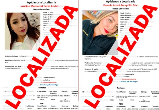 Derivado de la pronta activación de los mecanismos de búsqueda y del Protocolo Alba, instrumentados por la Fiscalía Especializada en Atención a Mujeres Víctimas del Delito por Razones de Género y a la Familia, fueron localizadas sanas y salvas Joselyn Monserrat P. A., de 18 años de edad, y Pamela Anahí R. D., de 26 años, quienes contaban con reportes de ausencia en la ciudad de Chihuahua.