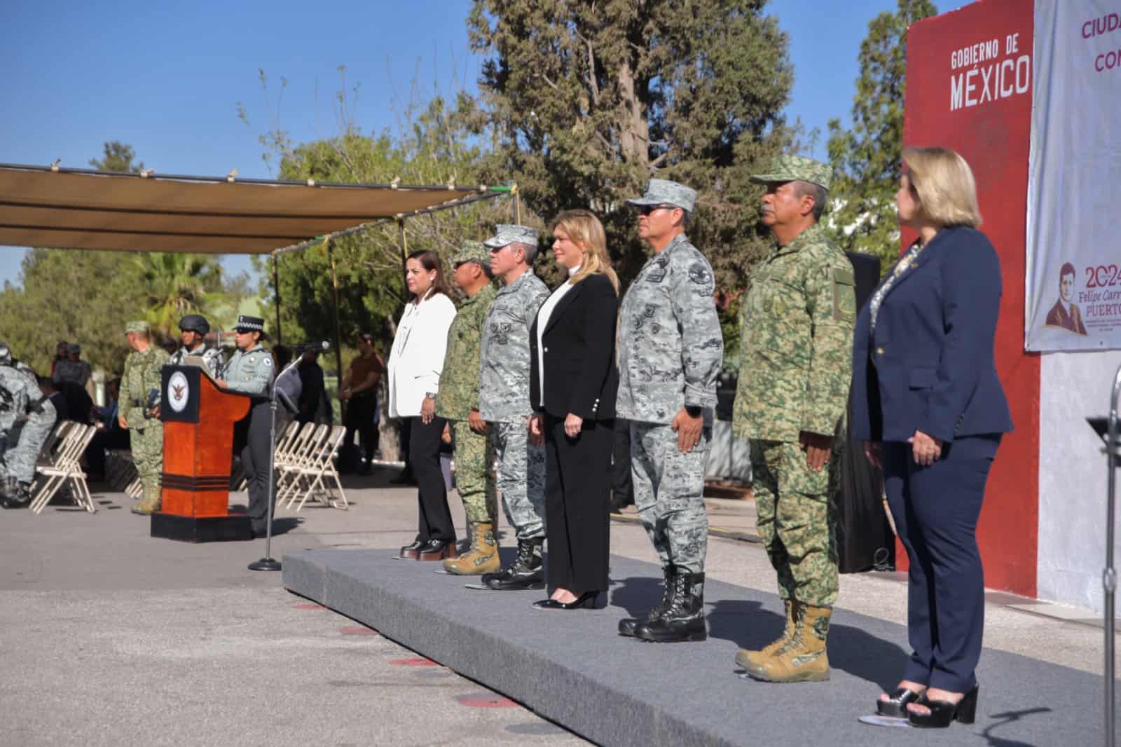 Además de la titular del Ejecutivo, también asistieron al evento las presidentas del Tribunal Superior de Justicia y del Congreso del Estado, los comisarios de las zonas militares 42ª y 5ª, y el titular de la Unidad de Órganos Especializados por competencia de la Guardia Nacional.