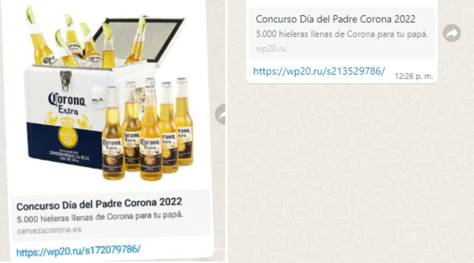 Los “ciberdelincuentes” se hacen pasar por la empresa Corona y piden a las víctimas registrarse para un concurso de una hielera en conmemoración del Día del Padre, por lo cual envían el enlace https://wp20.ru/s172079786/ el cual redirige a una pantalla en la que se solicita el ingreso de datos personales y al dar clic en “enviar” se da el robo de información.