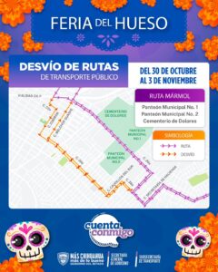 La Secretaría General de Gobierno, a través de la Subsecretaría de Transporte informó que con motivo de la tradicional Feria del Hueso y el Día de Muertos, serán modificadas algunas rutas de autobús debido al cierre temporal de avenidas y calles aledañas a los panteones de la ciudad.