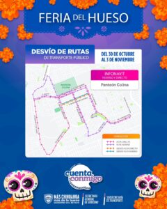 La Secretaría General de Gobierno, a través de la Subsecretaría de Transporte informó que con motivo de la tradicional Feria del Hueso y el Día de Muertos, serán modificadas algunas rutas de autobús debido al cierre temporal de avenidas y calles aledañas a los panteones de la ciudad.