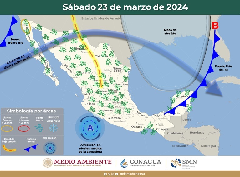 En el transcurso del domingo 24, el nuevo sistema frontal 42 se asociará con una vaguada polar y la corriente en chorro, lo que podría dar origen a la Octava Tormenta Invernal de la temporada y generar descenso en las temperaturas.