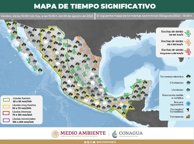 Estas precipitaciones pueden estar acompañadas de posible caída de granizo, descargas eléctricas y vientos fuertes, que crearán las condiciones para tolvaneras en tramos carreteros del territorio estatal.