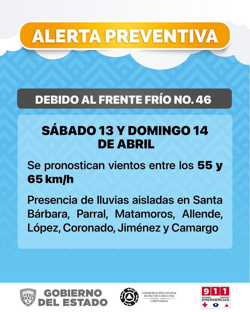 La Coordinación Estatal de Protección Civil (CEPC) dio a conocer que para este domingo 14 y lunes 15 de abril, se prevé la presencia de vientos de moderados a fuertes en gran parte del estado, generados por el ingreso del frente frío número 46 a la entidad.