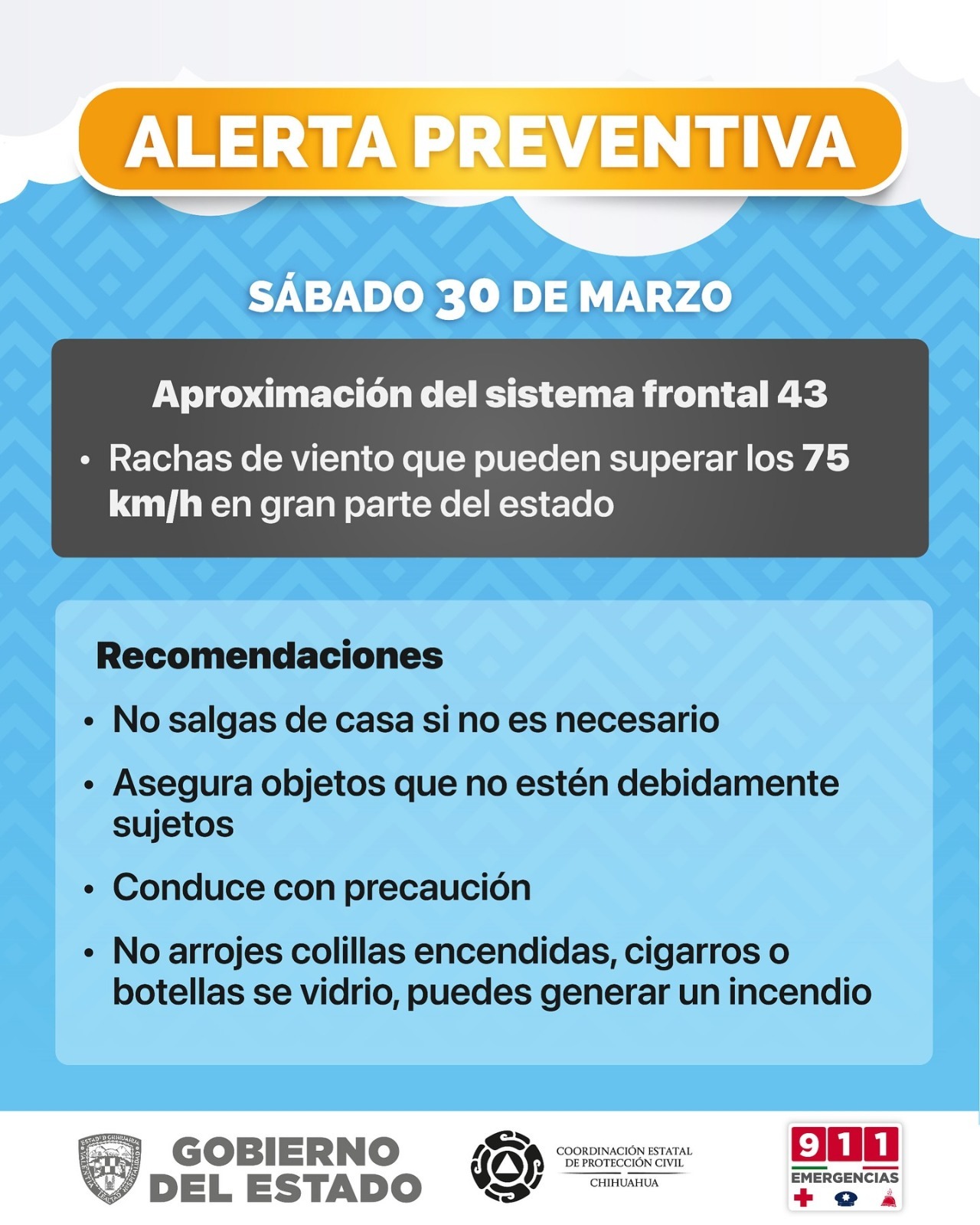 Para hoy se esperan rachas de viento de hasta 75km/h en Casas Grandes, Ignacio Zaragoza, Gómez Farías, Buenaventura, Namiquipa, Bachíniva, Guerrero, Bocoyna, Carichí, Guachochi, Guadalupe y Calvo, Nonoava, Cuauhtémoc, Riva Palacio, Gran Morelos, Chihuahua (Majalca) y San Francisco del Oro.