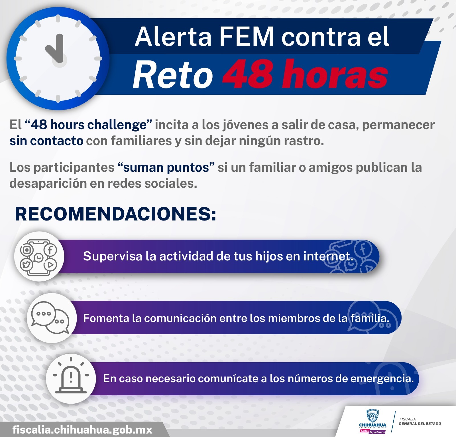 La Fiscalía Especializada en Atención a Mujeres Víctimas del Delito por Razones de Género y a la Familia, zona norte, exhorta a los padres de familia a promover la comunicación con sus hijos y vigilar las actividades que realizan a través de internet y redes sociales, a fin de evitar situaciones de riesgo.