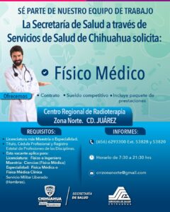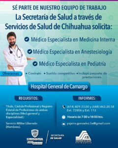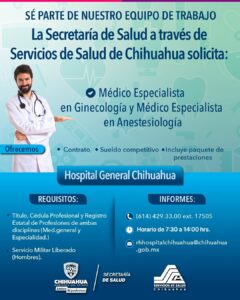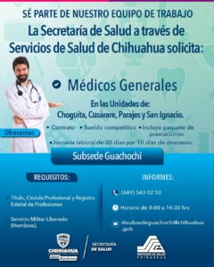 La Secretaría de Salud, a través de la Subdirección de Recursos Humanos, da a conocer las vacantes para ocupar los puestos disponibles en sus diferentes unidades hospitalarias, ubicadas en la capital del estado, Camargo y Juárez, así como en las localidades de Choguita, Cusárare, Parajes y San Ignacio, en la zona serrana.
