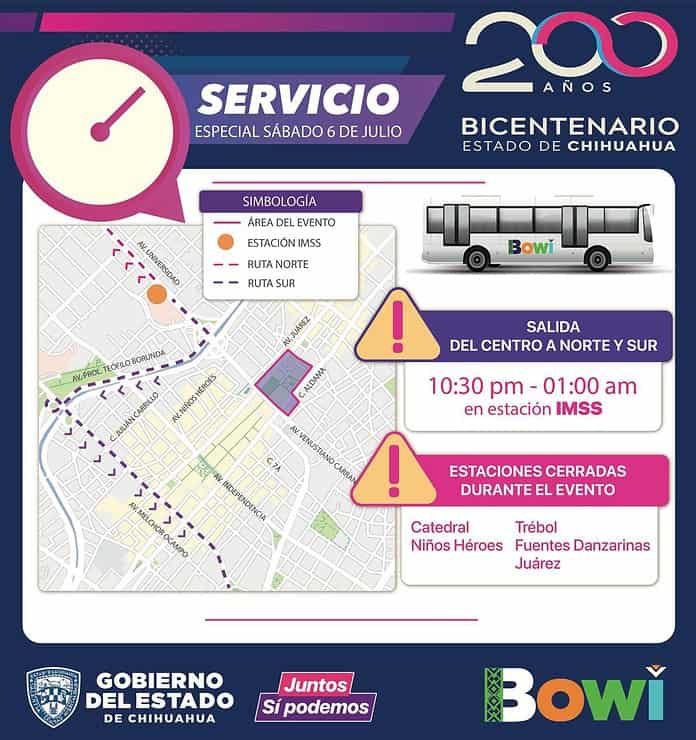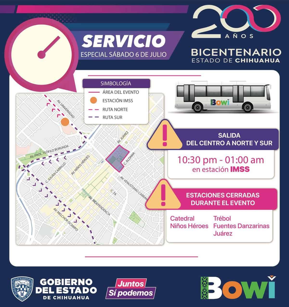 La Operadora de Transporte (OTV) informa que el horario en el servicio del sistema de transporte BOWI, se extenderá este sábado 6 de julio por el concierto que los cantantes Emmanuel y Mijares, encabezarán en la Plaza del Ángel.