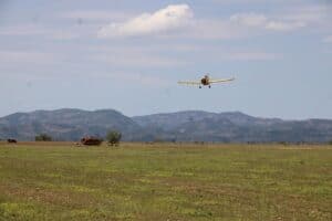 La aplicación aérea del agente (metarhizium acridum), se realiza de dos maneras: con un dron especializado cuando la zona de afectación es pequeña, y con avioneta cuando existe mayor superficie en riesgo.