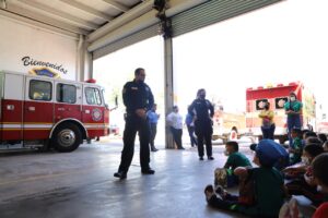 Fueron estudiantes y docentes del kínder “Misael Núñez Acosta”, ubicado en la colonia Popular, quienes solicitaron realizar una visita guiada para que los menores conocieran de cerca a los agentes preventivos y bomberos que día a día cuidan de ellos y sus familias.