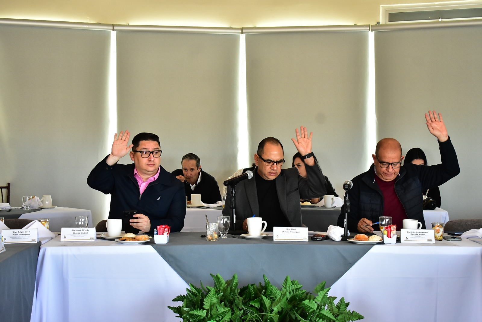 Cabe mencionar que en esta reunión estuvieron presentas las y los diputados: Noel Chávez en su calidad de presidente de la JUCOPO y Coordinador del Grupo Parlamentario del PRI, Alfredo Chávez, Coordinador del Grupo Parlamentario del PAN; Cuauhtémoc Estrada, Coordinador del Grupo Parlamentario de MORENA; Francisco Sánchez, representante de MC, así como Everardo Rojas, Secretario de Asuntos Legislativos y Jurídicos y, Otto Rodríguez, Secretario de Administración.
