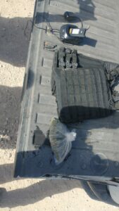 Dentro de los vehículos se localizó una granada de mano sin activar, un chaleco táctico de color negro con placas balísticas, un cargador para radio de comunicación, 4 cartuchos útiles calibre .223 y 2 bolsas con una hierba verde, seca y olorosa similar a la marihuana.