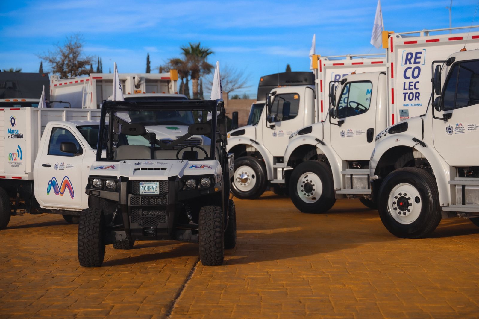 El municipio entregó seis camiones nuevos de recolección de basura habitacional, tres pick up de carga ligera, un vehículo de carga compacto, además de dos camiones de volteo y dos pipas para dar servicio al relleno sanitario.