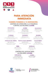 Lo anterior, a través de los once Centros de Atención a la Violencia Contra las Mujeres (CAVIM) en Chihuahua, Juárez, Parral, Cuauhtémoc, Morelos, Camargo, Madera, Nuevo Casas Grandes, Creel, Guachochi y Ojinaga.