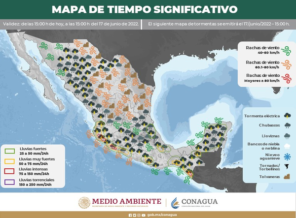 La Coordinación Estatal de Protección Civil (CEPC) informa que para este fin de semana y el lunes 20 de junio es probable que se presenten lluvias sobre las regiones serranas, noroeste, norte y centro sur del estado, con intervalos de chubasco acompañadas por posible caída de granizo, fuertes vientos y tormentas eléctricas.
