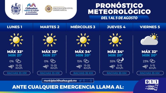 De acuerdo al pronóstico que emite el Servicio Meteorológico Nacional de CONAGUA, para este lunes se espera una máxima de 33°C y una mínima de 21°C con vientos de hasta 35 kilómetros por hora, con un cielo mayormente soleado sin probabilidad de lluvia; por otra parte, para el martes se prevé una máxima de 32°C y mínima de 21°C con vientos de hasta 35 kilómetros por hora, con un cielo mayormente soleado sin probabilidad de lluvia.