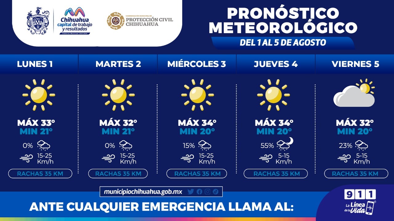 Para el día miércoles la máxima la máxima será de 34°C y la mínima de 20°C con vientos de hasta 35 kilómetros por hora, un cielo mayormente soleado y un 15 por ciento de probabilidad de lluvia por la tarde; mientras que, para el jueves se espera una máxima de 34°C y una mínima de 20°C, con vientos de hasta 35 kilómetros por hora y un cielo mayormente soleado con 55 por ciento de probabilidad de lluvia por la noche.