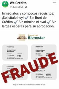 Dijo que en días anteriores se detectó en redes sociales diversos anuncios con la promesa de obtener de manera fácil y sin requisitos créditos y préstamos que van desde los 10 mil hasta los 40 mil pesos.