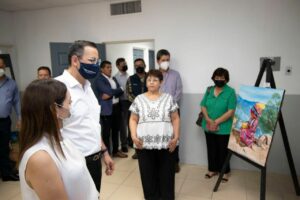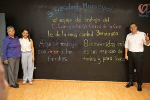 El alcalde Marco Bonilla, la presidenta del DIF Municipal, Karina Olivas y vecinos de la colonia, participaron en el corte del listón del recién remodelado Centro Comunitario de la colonia Cerro de la Cruz, el cual tuvo una inversión de 4 millones 247 mil del Presupuesto Participativo y una aportación directa de 419 mil pesos del DIF para el beneficio de 210 usuarios y sus familias que de lunes a viernes acuden a este lugar para practicar box, futbol, básquetbol, spinning o asisten a alguna cita médica.
