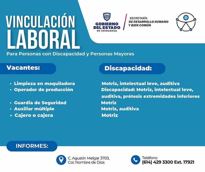 El Departamento de Vinculación Laboral de Grupos Vulnerables, de la Secretaría de Desarrollo Humano y Bien Común (SDHyBC), dio a conocer que empresas inclusivas abrieron vacantes para diversos puestos laborales dirigidos a personas mayores o con discapacidad.
