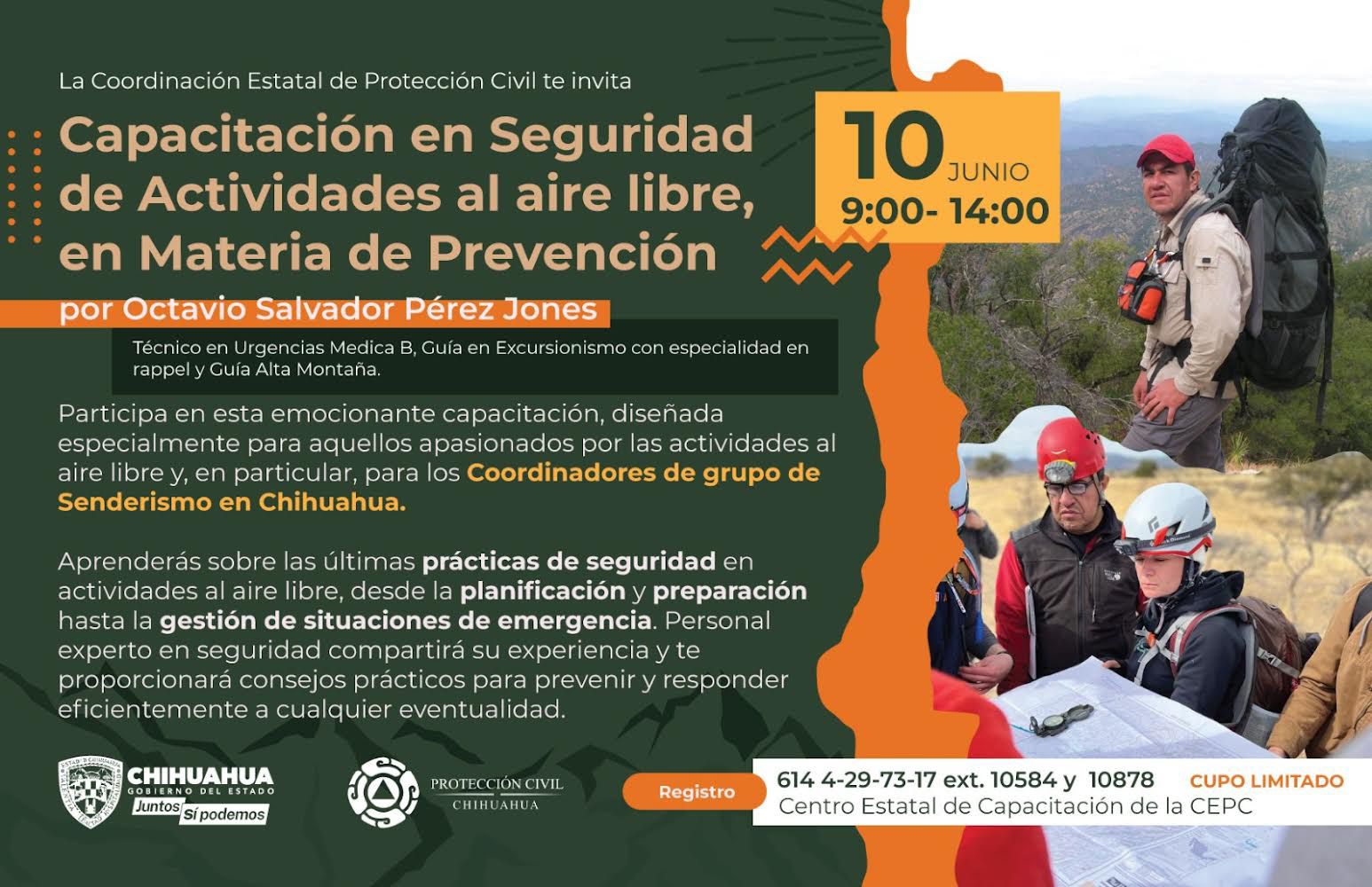 La Coordinación Estatal de Protección Civil (CEPC) invita a la comunidad a participar en la capacitación en seguridad de actividades al aire libre en materia de prevención, que se realizará el próximo sábado 10 de junio desde las 9:00 hasta las 14:00 horas en el centro estatal de capacitación de la dependencia.