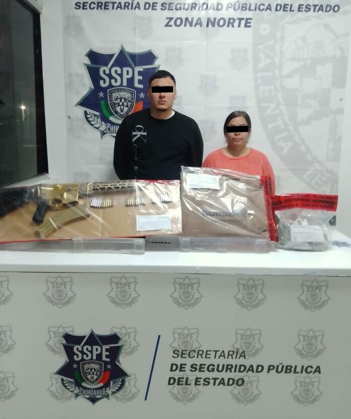 Elementos de la Secretaría de Seguridad Pública del Estado (SSPE), adscritos a Zona Centro-Sur que se encuentran desplegados para reforzar el operativo de seguridad en Ciudad Juárez, detuvieron a una mujer y un hombre a quienes aseguraron un arma larga de color dorado y varios paquetes de droga.