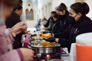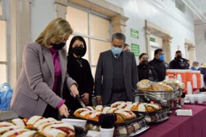 En el pasillo principal del inmueble, la Gobernadora fue la primera en partir el simbólico alimento, acompañada por el secretario de Salud, Felipe Fernando Sandoval y la directora del nosocomio, Eréndira Martínez Anchondo.