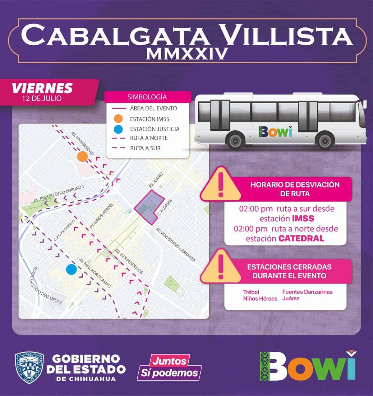 La Secretaría General de Gobierno, a través de la Operadora de Transporte (OTV), informa que este viernes 12 de julio a partir de las 2 de la tarde, cuatro estaciones de BOWI en la zona centro permanecerán cerradas debido al arribo de la tradicional Cabalgata Villista.