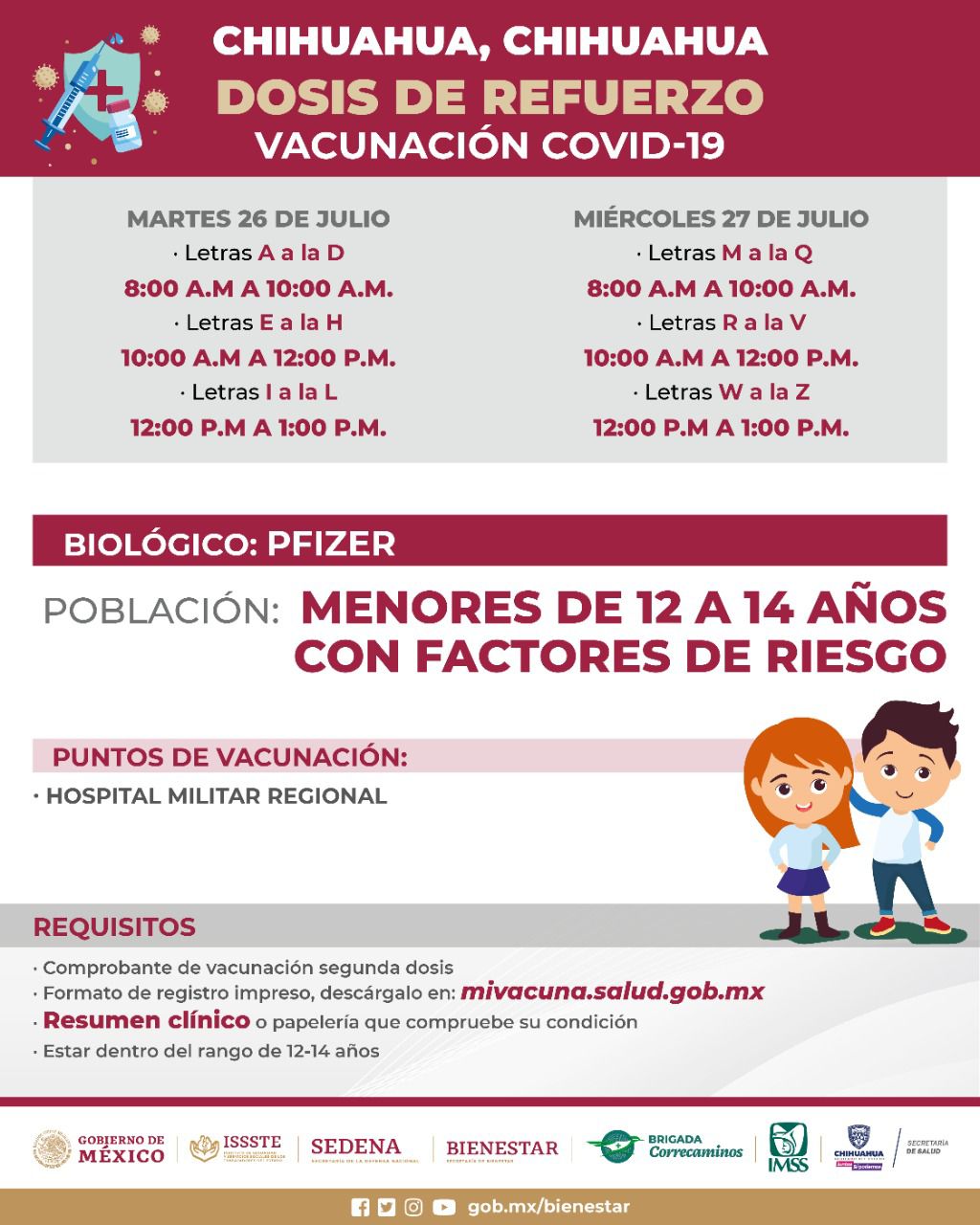 El punto de vacunación será el Hospital Militar Regional de la Ciudad de Chihuahua. Los requisitos son: comprobante de vacunación de la segunda dosis, formato de registro, descargable en mivacuna.salud.gob.mx, resumen clínico o papelería que compruebe su condición, y estar dentro de la edad de 12 a 14 años.