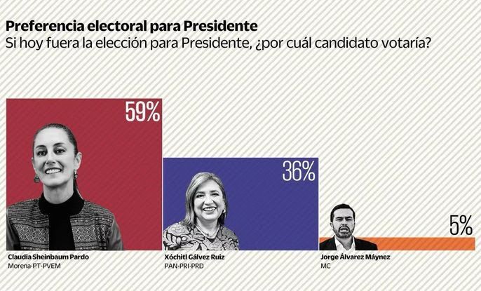 Los resultados muestran que hasta el momento la intención de voto efectiva se inclina 59% a Sheinbaum Pardo, quien representa a la coalición Morena-PVEM-PT, mientras Gálvez, de la alianza PAN-PRI-PRD, obtiene 36%. Por su lado, Jorge Álvarez Máynez, de Movimiento Ciudadano (MC), registra 5%.