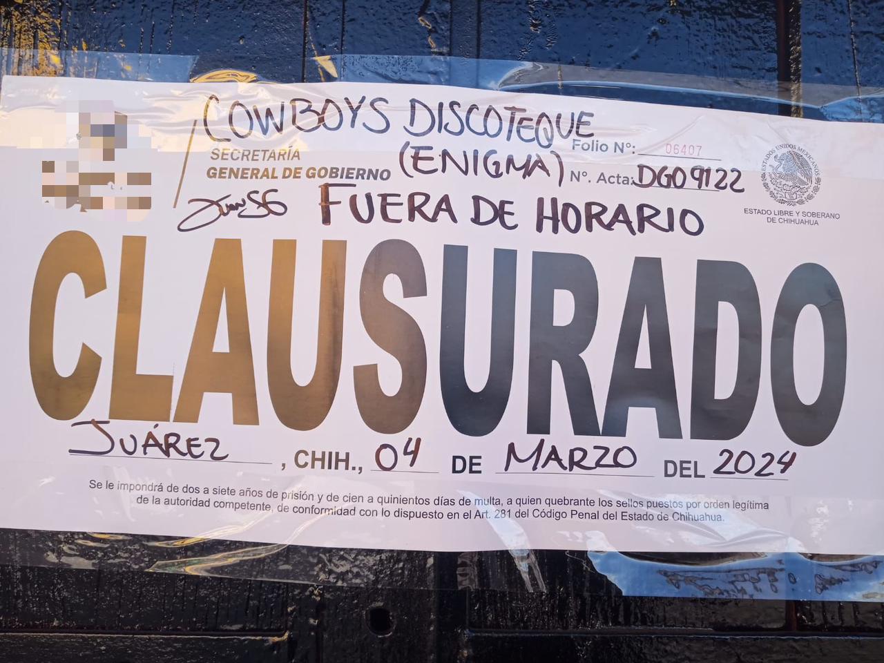• Salón de baile “Cowboy Discoteque (Enigma)”, por operar fuera de horario (Ciudad Juárez).