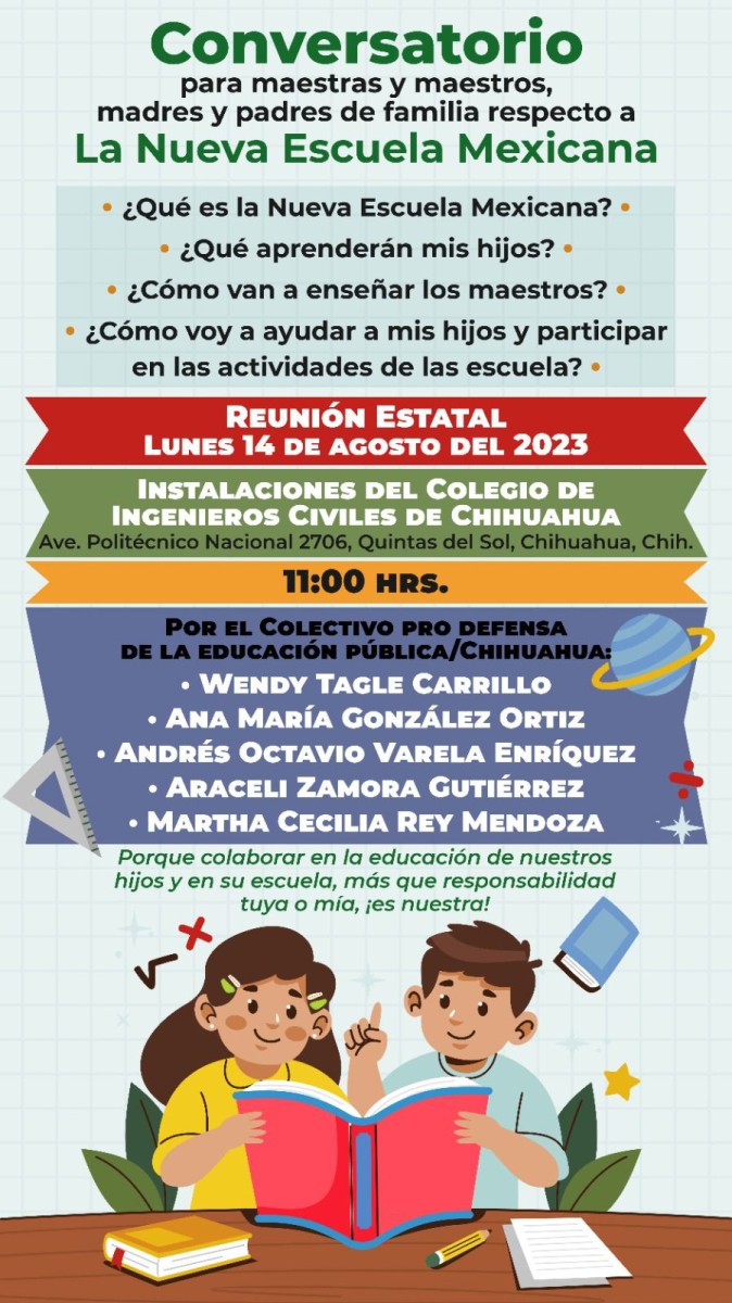 El Colectivo Pro Defensa de la Educación Chihuahua, llevará a cabo este lunes a las once de la mañana un Conversatorio sobre la Nueva Escuela Mexicana, en el que estarán presentes diversos academicos a fin de proporcionar herramientas a profesores, madres y padres de familia sobre los temas que abordan los planes de estudios elaborados en esta administración.