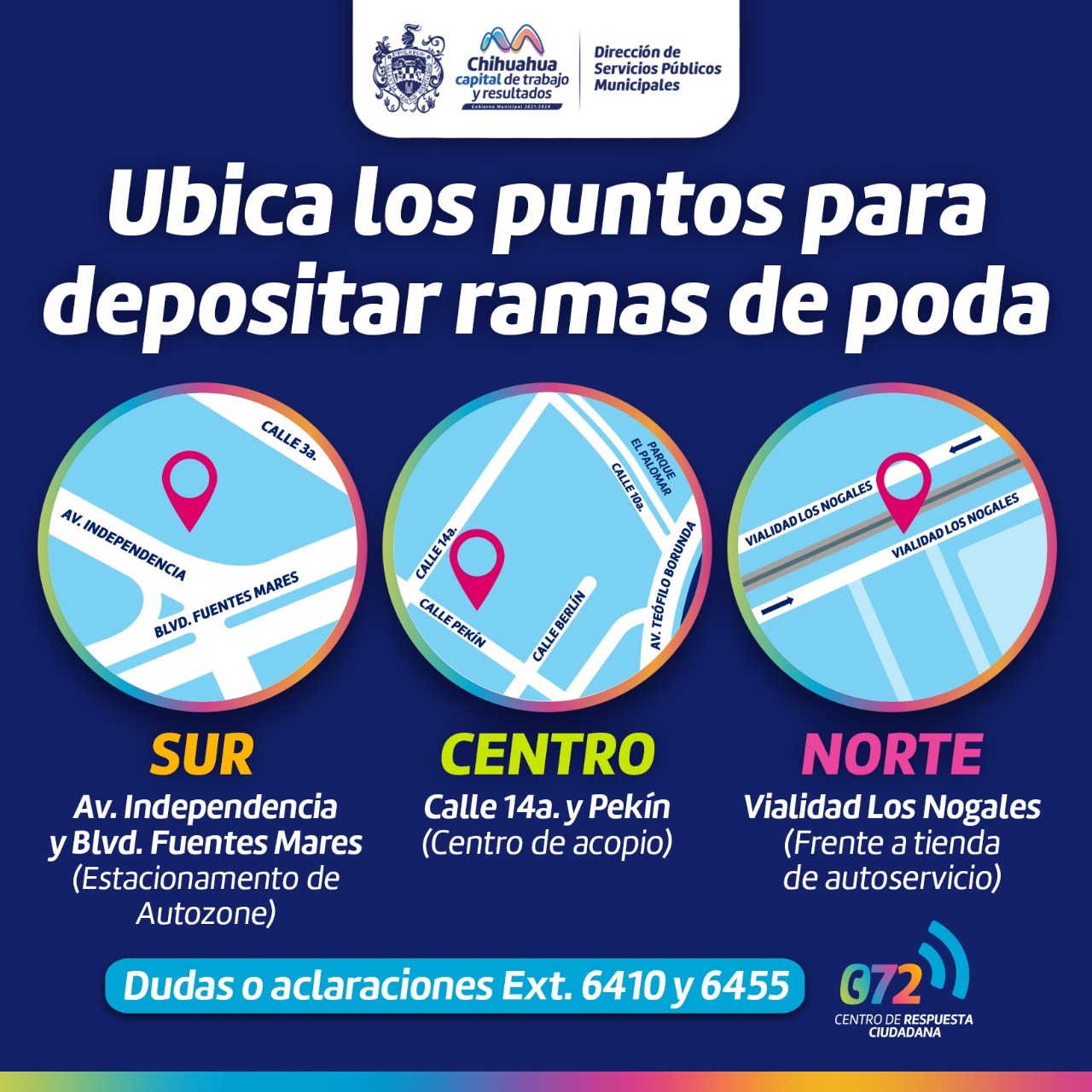 Servicios Públicos Municipales y la dirección de Mantenimiento Urbano, invita a la población a hacer uso de los contenedores para ramas de poda, que estarán instalados en tres puntos de la ciudad, a partir del lunes 23 de enero al sábado 25 de febrero.