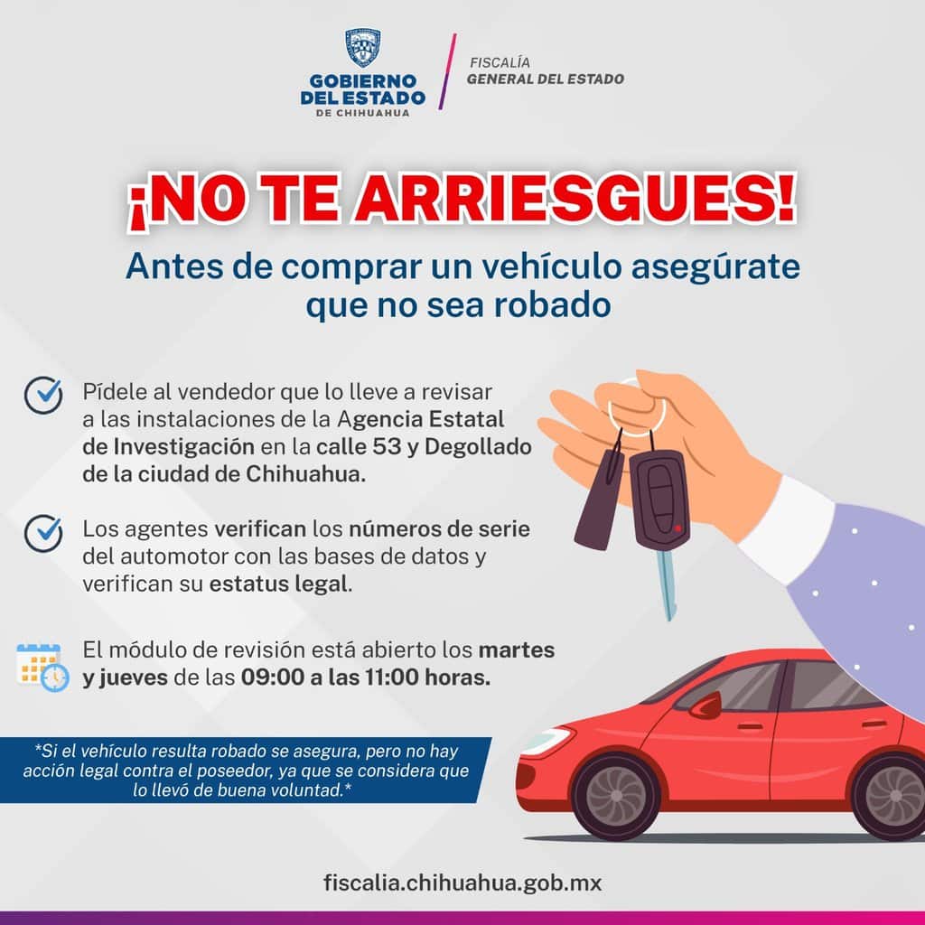 La Unidad de Investigación del Delito de Robo de Vehículos de la Fiscalía de Distrito Zona Centro, exhorta a los ciudadanos que contemplan adquirir un vehículo usado, que exijan al vendedor que lo lleven a revisar al módulo de la Agencia Estatal de Investigación para cerciorarse que no es robado.