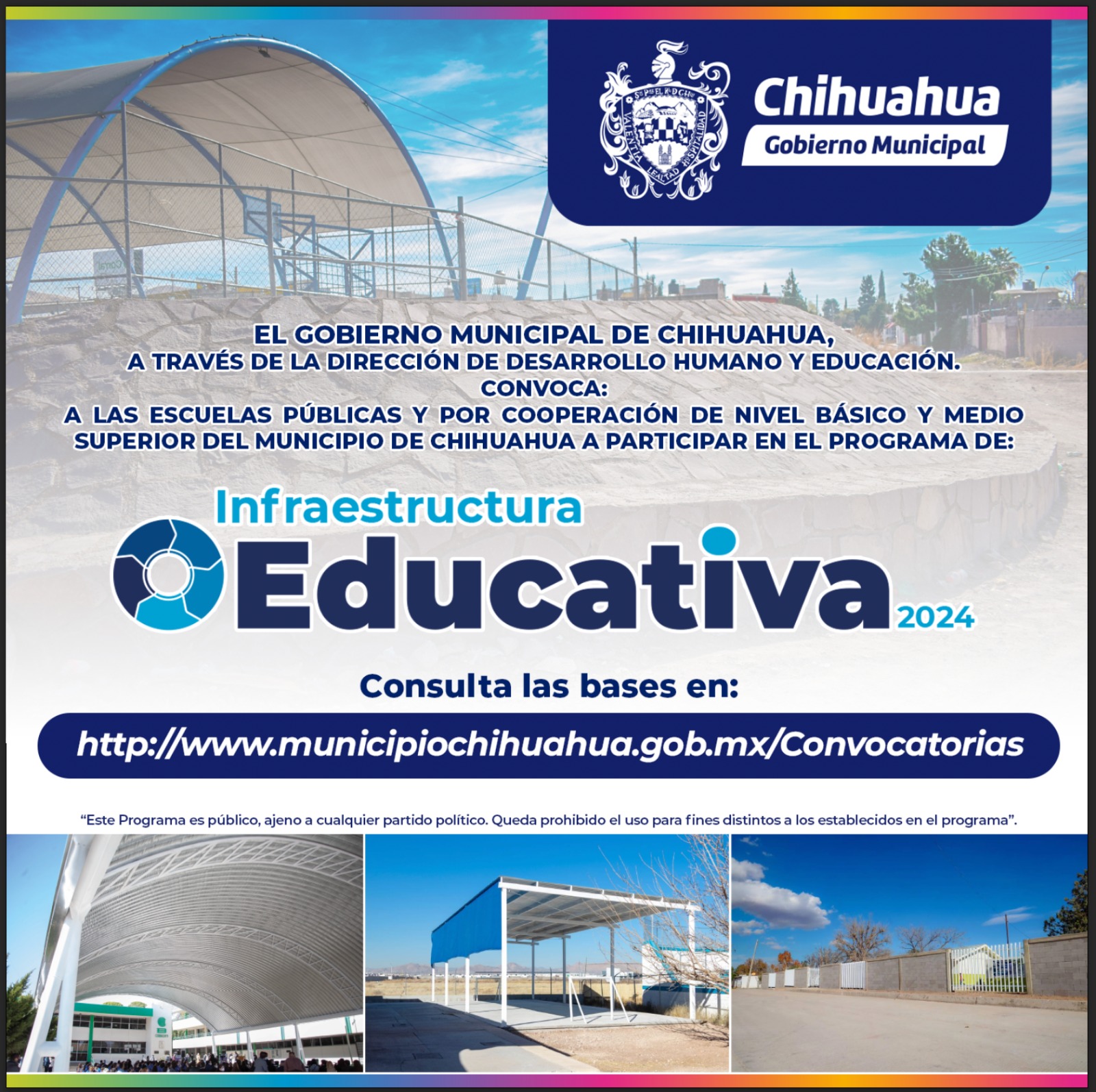 La dirección de Desarrollo Humano y Educación, da a conocer que ya se encuentra disponible la convocatoria del programa “Infraestructura Educativa”, para las escuelas públicas y por cooperación de nivel básico y medio superior del municipio de Chihuahua.