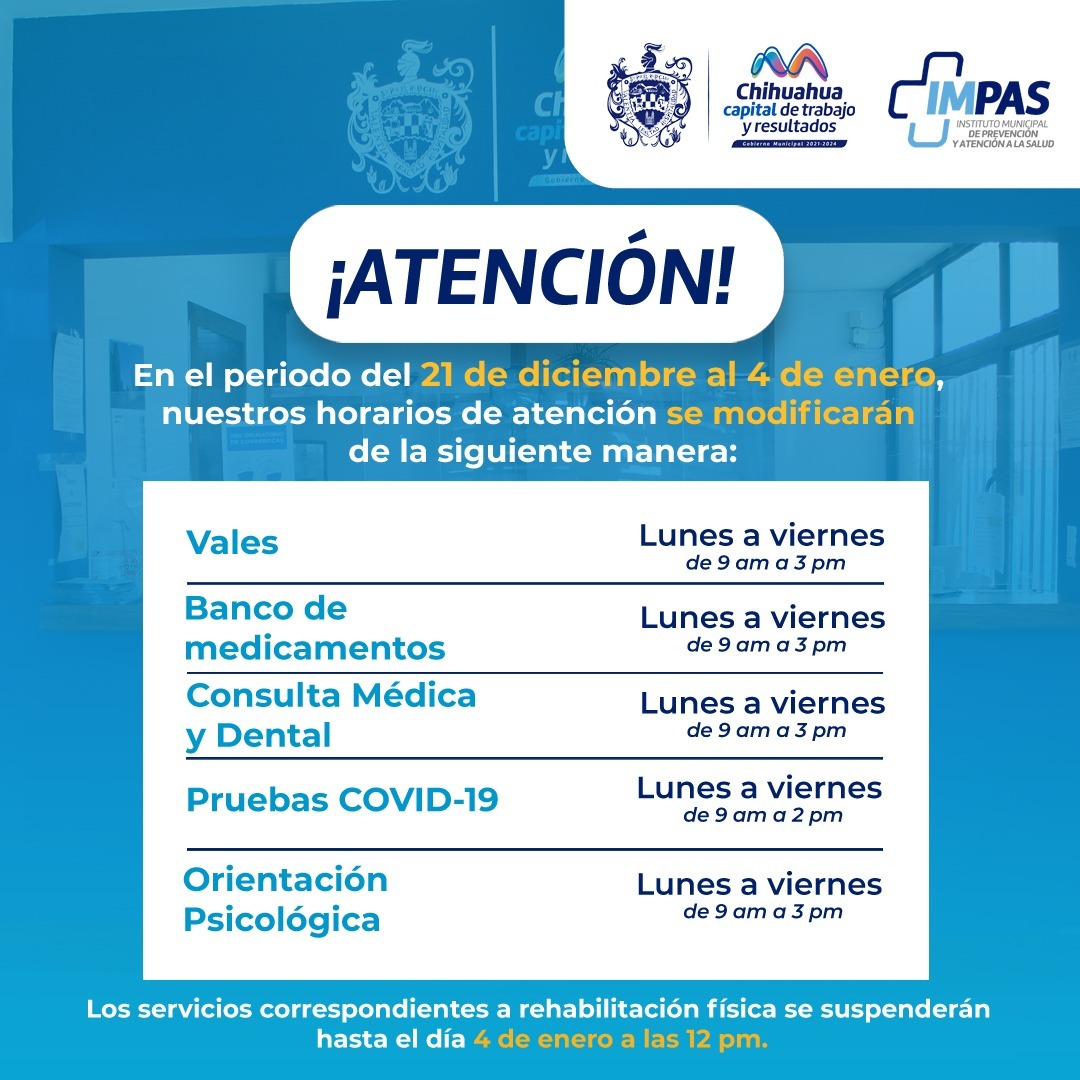 El Instituto Municipal de Prevención y Atención a la Salud (IMPAS) informa que por temporada navideña los horarios para la prueba de COVID-19, atención médica, dental y psicológica, cambian su horario a partir del 21 de diciembre y hasta el 4 de enero del 2023.