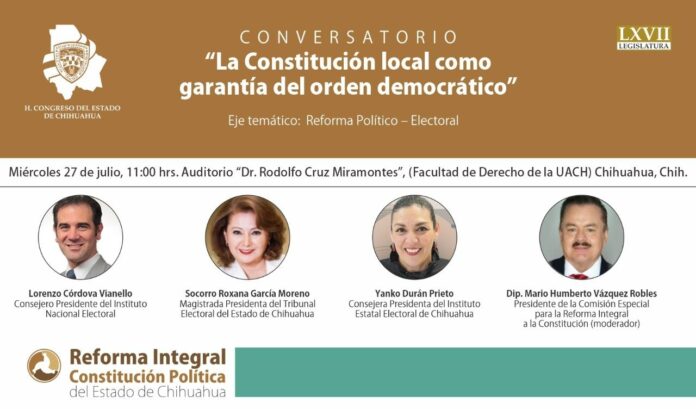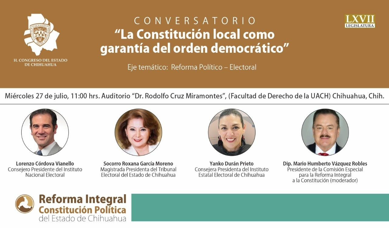 El Instituto Estatal Electoral (IEE) invita a asistir el próximo miércoles 27 de Julio al conversatorio “La Constitución Local como garantía del orden democrático”, presentado por el Congreso del Estado de Chihuahua, con la participación de la consejera presidenta Yanko Durán Prieto.
