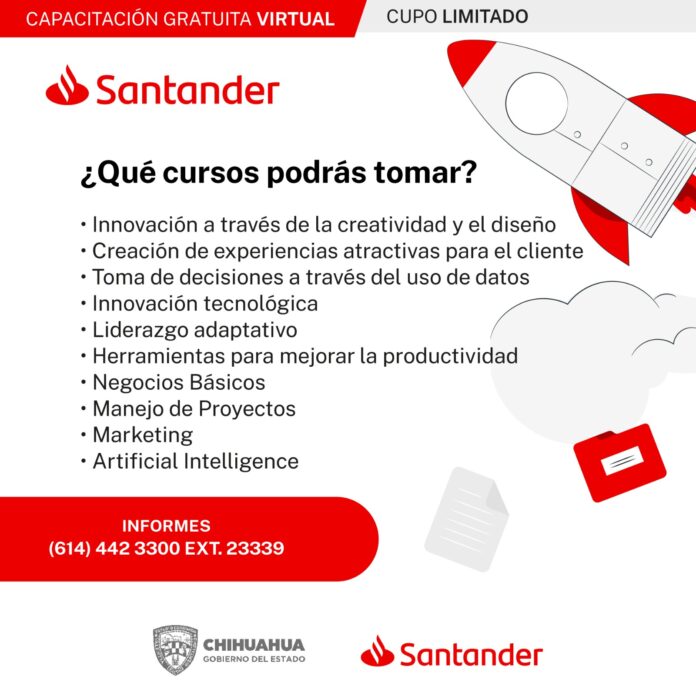 La Secretaría de Innovación y Desarrollo Económico y Banco Santander, invitan a participar en el “Curso Santander Talento Mipyme Chihuahua 2024”, iniciativa para impulsar la educación y las competencias profesionales, mediante la Santander Open Academy.