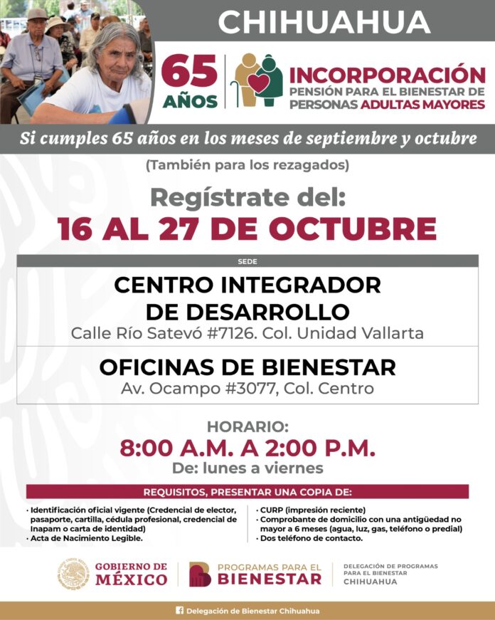 La secretaria de Bienestar, Ariadna Montiel Reyes, informó que del 16 al 28 de octubre se realizará en todo el país el registro de incorporación a la Pensión para el Bienestar de las Personas Adultas Mayores para quienes cumplen 65 años en los meses de septiembre y octubre.