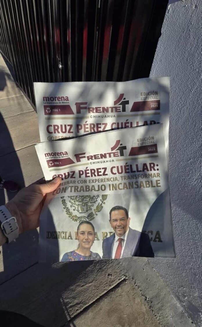 “Estos ejemplares se han detectado de momento, siendo distribuidos en forma masiva, en las colonias de la periferia de la Ciudad de Chihuahua, como se aprecia de las siguientes fotografías que se obtuvieron en la colonia Cerro de la Cruz y Colonia Los Pinos, entregándose por brigadas de militantes de MORENA, como se aprecia en la siguiente foitografía”, señala la denuncia que fue recibida por el Instituto Estatal Electoral el pasado 28 de noviembre.