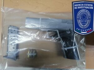 Durante la misma inspección, los agentes localizaron entres las pertenencias de los detenidos un arma de fuego calibre .9 milímetros, abastecida con tres cartuchos útiles, así como un envoltorio con una sustancia granulada con las características de la metanfetamina denominada cristal.
