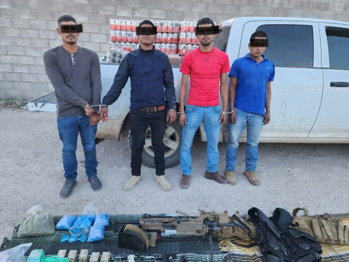 Derivado del despliegue operativo realizado por la policía estatal, la Secretaría de Seguridad Pública, logró la detención de cuatro personas, así como el aseguramiento de armamento de uso exclusivo del Ejército, cartuchos útiles, equipo táctico, dinero en efectivo, droga y un vehículo con reporte de robo.