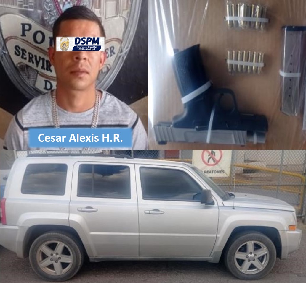 Por conducir una camioneta robada, portar un arma de fuego y llevar sustancias ilícitas, policías municipales lograron la detención de un hombre cuando éste circulaba por la carretera vieja a Aldama, quien deberá responder ante el ministerio público por los probables delitos en que pudiera estar involucrado.