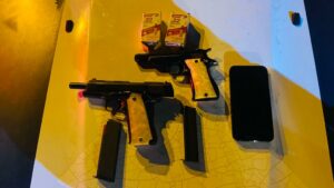 Una vez que se le da alcance al vehículo, se realizó una inspección al interior del mismo y se localizaron dos armas de fuego, una de calibre .22 y otra calibre .45 ACP, además de dos cajas con 96 cartuchos útiles calibre .22.
